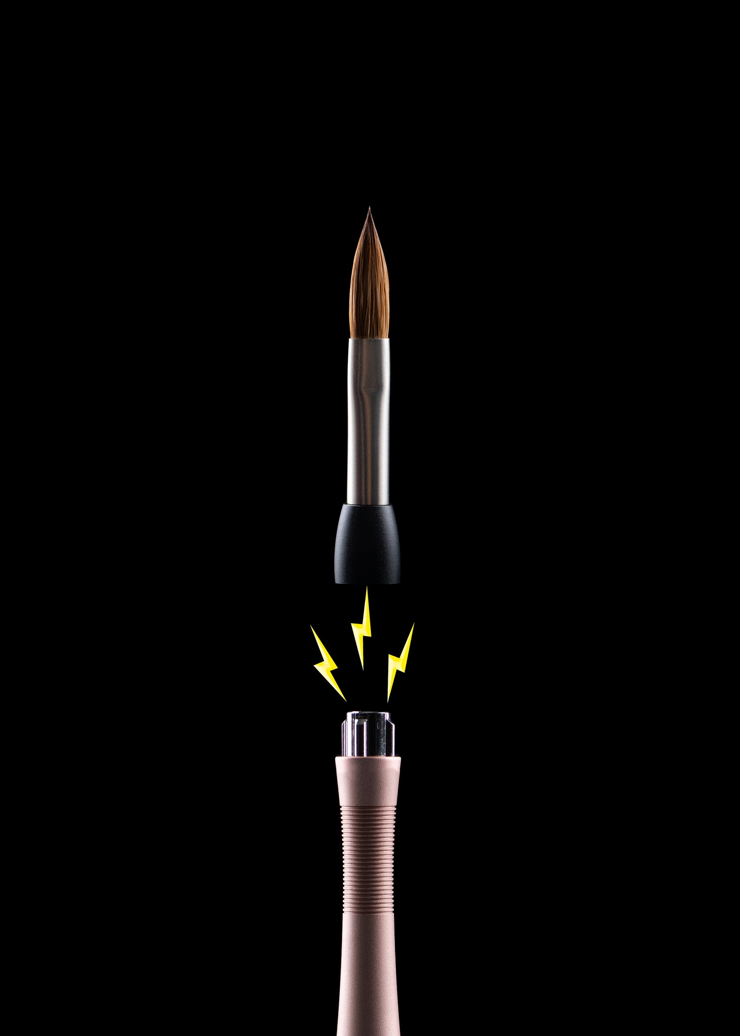 Unique aluminium handles with magnetic connection that allows brush tips to be changed instantly.
